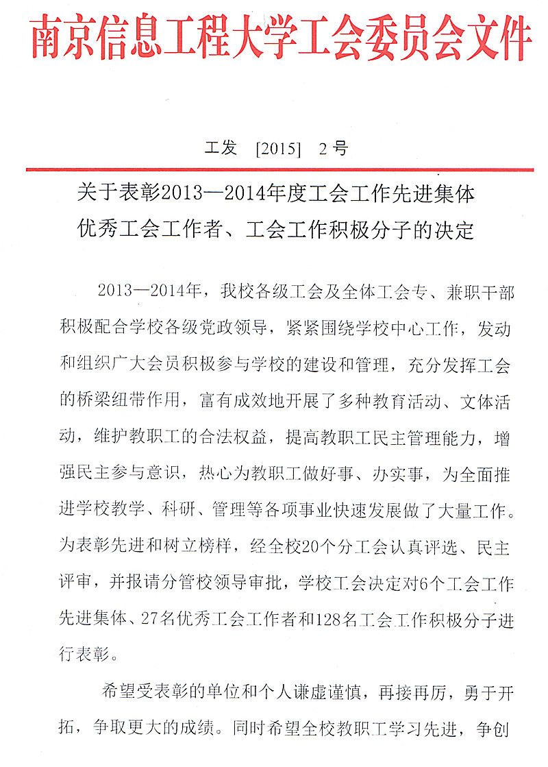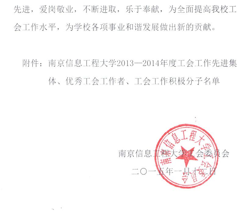 附:南京信息工程大学2013-2014年度工会工作先进集体、优秀工会工作者、工会工作积极分子名单