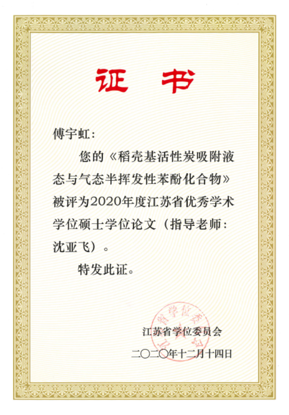傅宇虹同学的学位论文荣获“江苏省优秀学术学位硕士学位论文”